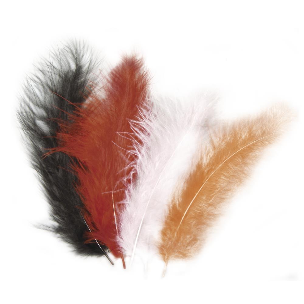 Delikatne, puszyste piórka o długości 10-15 cm w kolorach białym, czarnym i odcieniach brązu.