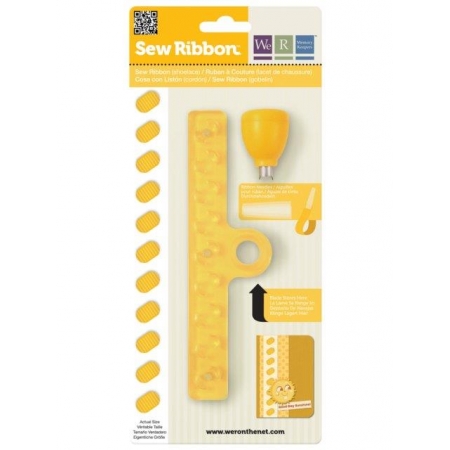 Dzięki dziurkaczom Sew Ribbon firmy WeRMemoryKeepers możesz ozdobić swoje prace, jak kartki, albumy, przepiśniki, notesy, pamiętniki wyjątkowymi wzorami uplecionymi wstążkami i taśmami. Wystarczy rozłożyć szablon na dwie części i umieścić w nim papier. Dzięki magnesom, bez problemu utrzyma się w wybranym przez Ciebie miejscu. Przedziurkuj kartkę, dociskając dołączonym ostrzem według widocznych otworów w szablonie. Następnie zdejmij szablon i przygotuj wstążkę lub taśmę. Na jednym z jej końców przymocuj plastikową, płaską samoprzylepną igłę i przeplataj nią przez powstałe nacięcia. Uzyskasz tym samym wyjątkowy wzór, np. liści, kwiatków i inne. Do wyboru masz kilka wzorów oraz sporą ilość różnego rodzaju wstążek i taśm. Możesz użyć wszystkich tych, których szerokość nie przekracza 1 cm.
